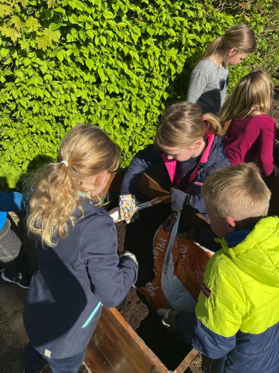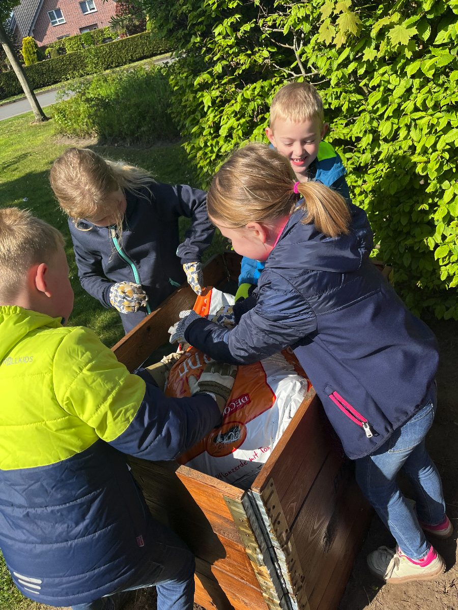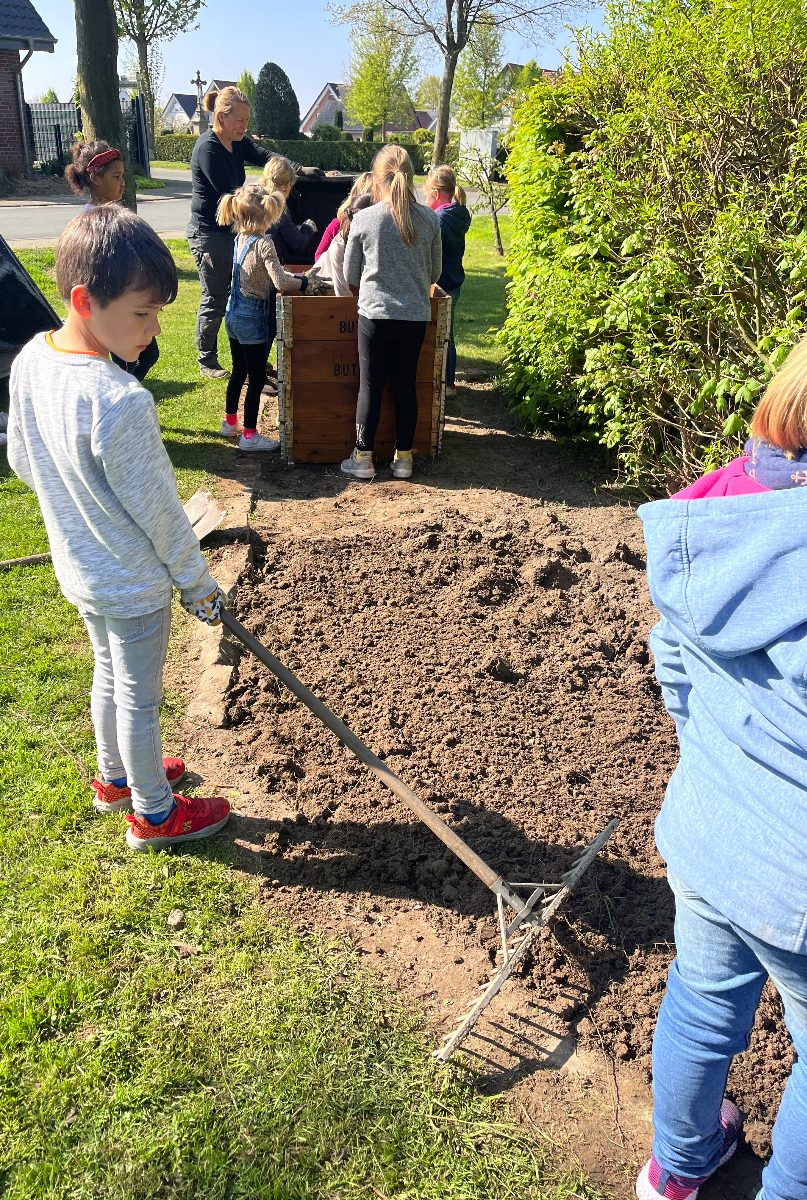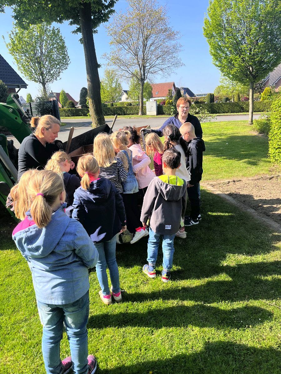 Nachdem die Klasse 1d das Außengelände des Benteleraner Standorts im März nach Frühblühern absuchte, wurde schnell der Schulgarten entdeckt und ein gemeinsamer Wunsch entstand: Den könnten wir doch mal wieder aufleben lassen! Gesagt, getan. Nachdem wir einige Wochen lang das mühsam gezüchtete Unkraut jäten mussten, wurde es letzte Woche richtig spannend: Dank der Hilfe von Verena und Renate Große-Wietfeld konnten wir nicht nur Obst, Gemüse und Blumen pflanzen, sondern lernten auch, welche Obst- und Gemüsesorten es gibt, welche Gartengeräte nützlich sind und was die Pflanzen zum Wachsen benötigen. Nach dem theoretischen Teil am Montag ging es Donnerstag ans Eingemachte: Familie Große-Wietfeld brachte mit dem Trecker alles vorbei, was wir zum Bepflanzen des Gartens und der eigens dafür hergerichteten Hochbeete benötigten. Ein besonderer Dank gilt Stefan Heinicke, der uns netterweise die beiden Hochbeete gespendet hat!