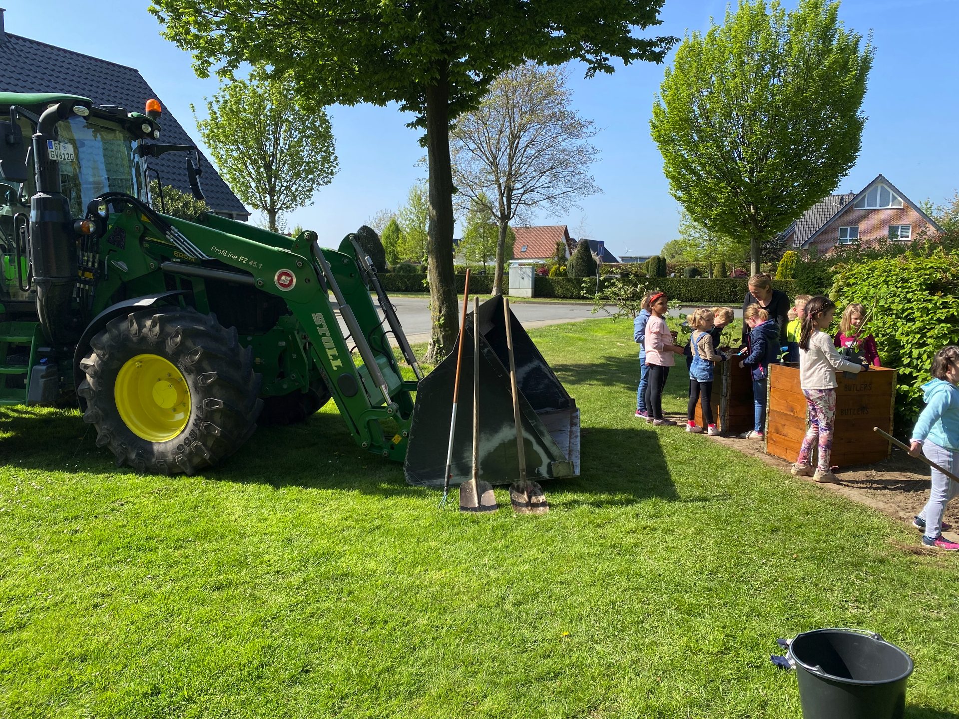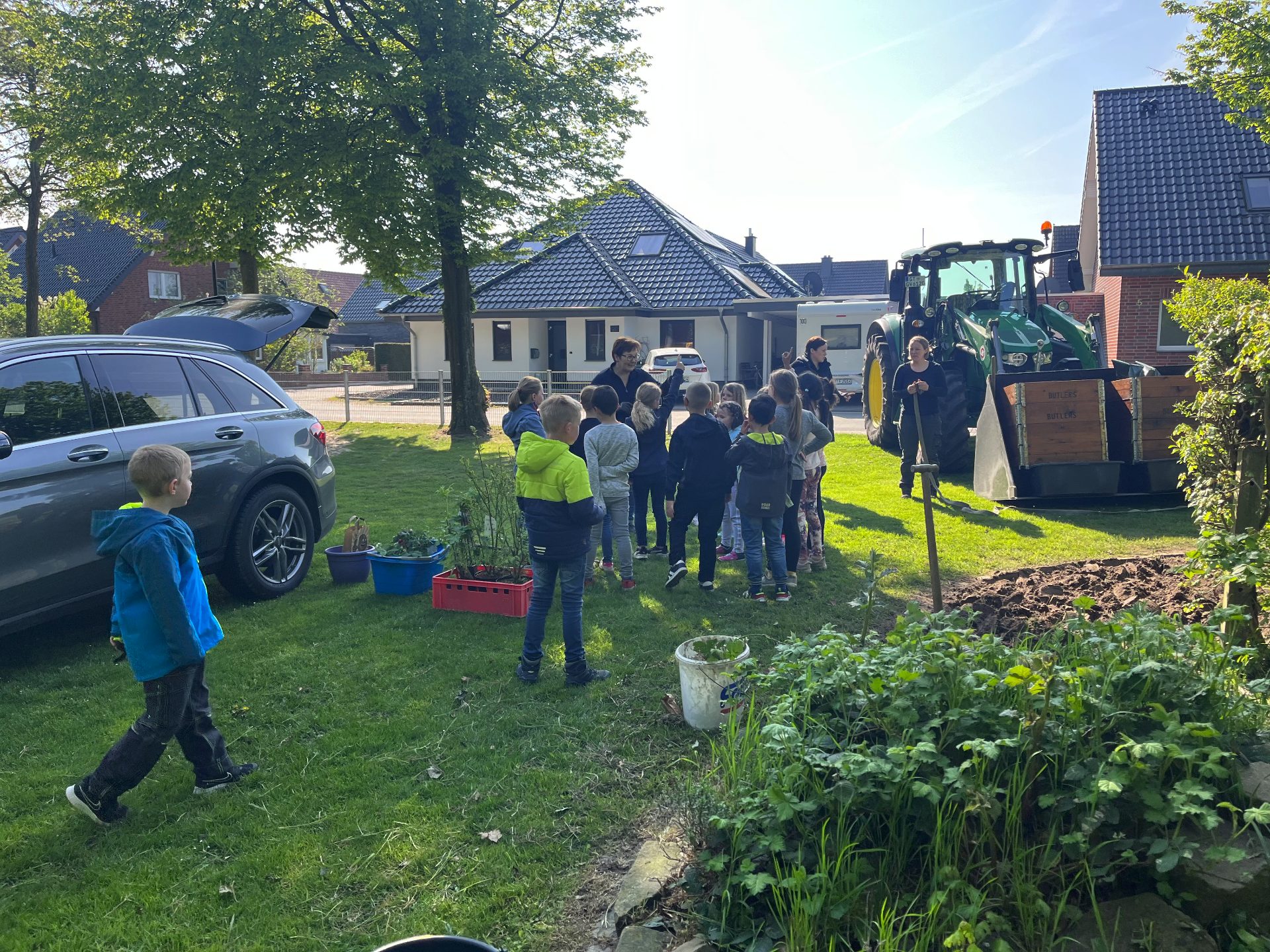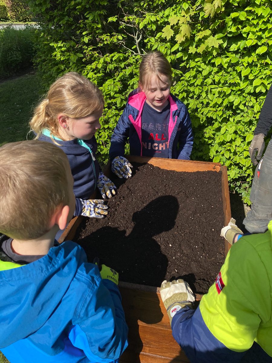 Nachdem die Klasse 1d das Außengelände des Benteleraner Standorts im März nach Frühblühern absuchte, wurde schnell der Schulgarten entdeckt und ein gemeinsamer Wunsch entstand: Den könnten wir doch mal wieder aufleben lassen! Gesagt, getan. Nachdem wir einige Wochen lang das mühsam gezüchtete Unkraut jäten mussten, wurde es letzte Woche richtig spannend: Dank der Hilfe von Verena und Renate Große-Wietfeld konnten wir nicht nur Obst, Gemüse und Blumen pflanzen, sondern lernten auch, welche Obst- und Gemüsesorten es gibt, welche Gartengeräte nützlich sind und was die Pflanzen zum Wachsen benötigen. Nach dem theoretischen Teil am Montag ging es Donnerstag ans Eingemachte: Familie Große-Wietfeld brachte mit dem Trecker alles vorbei, was wir zum Bepflanzen des Gartens und der eigens dafür hergerichteten Hochbeete benötigten. Ein besonderer Dank gilt Stefan Heinicke, der uns netterweise die beiden Hochbeete gespendet hat!