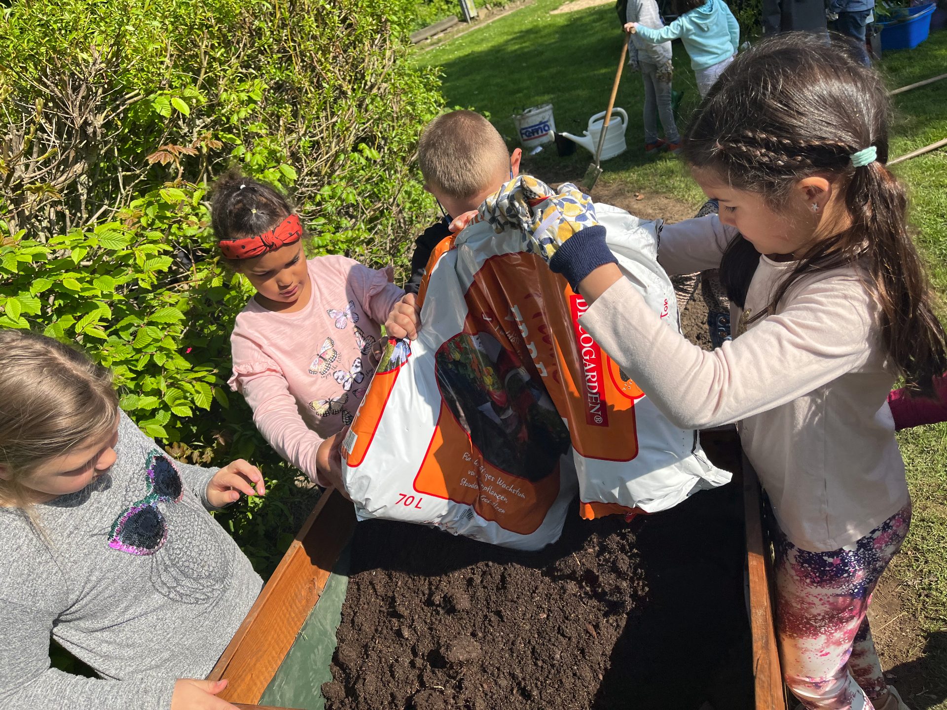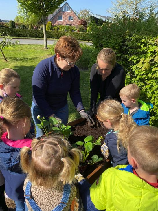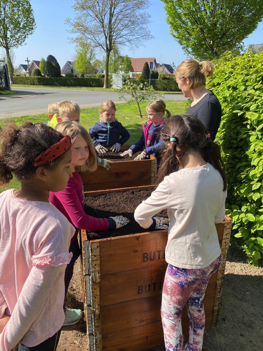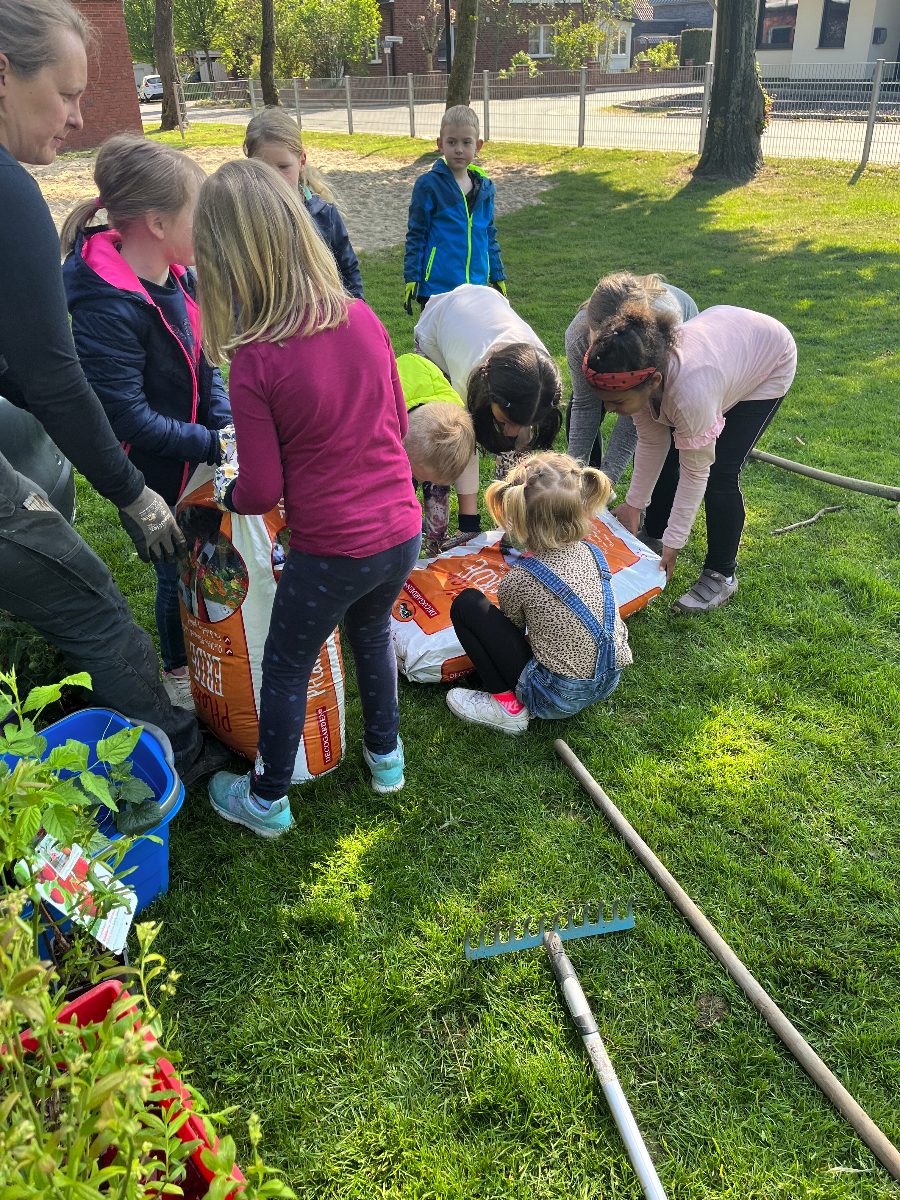 Bei strahlendem Sonnenschein befüllten die Kinder mit großem Eifer die Beete und pflanzten Johannisbeeren, Erdbeeren, Heidelbeeren, Kartoffeln, Radieschen, Zucchini, Gurken, Kohlrabi, Tomaten und Ringelblumen ein. Nun müssen sich die Kinder in Geduld üben und fleißig gießen, damit der Ernte im Sommer nichts mehr im Wege steht!