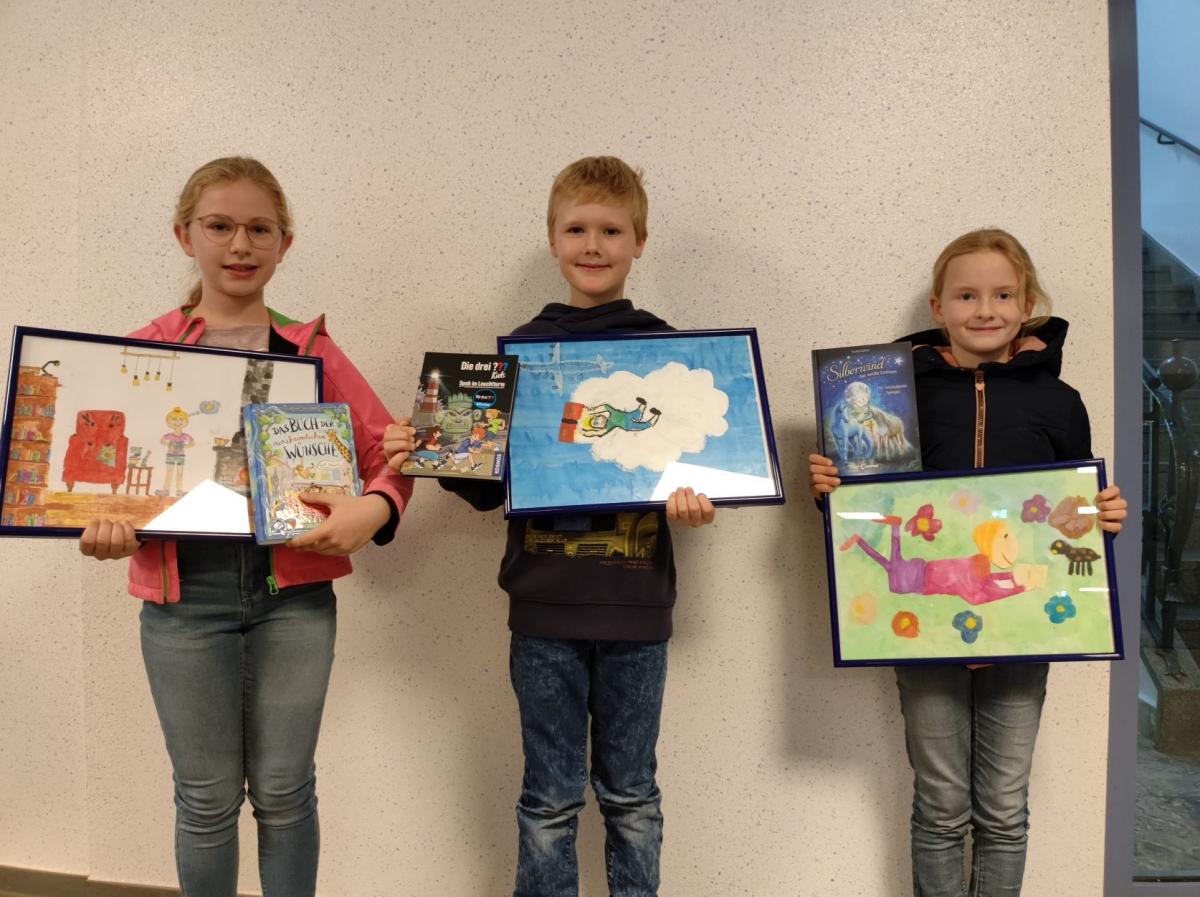 Hier überzeugten am Langenberger Standort Nela Peitz (Klasse 2c) auf dem dritten Platz, Noah Mütterties (Klasse 3a) auf dem zweiten Platz und Clara Großekatthöfer (Klasse 4c) auf dem ersten Platz mit ihren individuellen Bildern zu gemütlichen Lesesituationen.